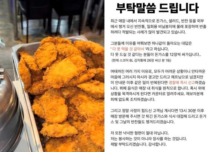 식당 측은 “최근 매장 내에서 지속적으로 돈가스, 샐러드, 반찬 등을 외부에서 챙겨 오신 반찬통, 일회용 비닐봉지에 몰래 포장해 반출하려다 적발되는 사례가 많이 발견됐다”고 전했다.