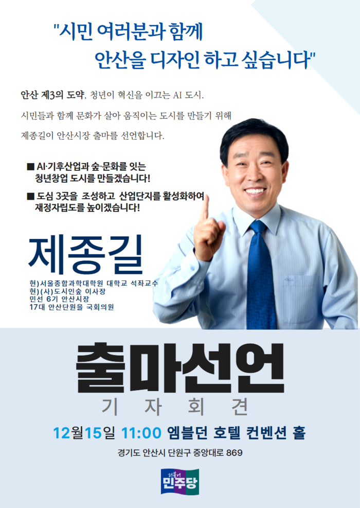 제 전 시장은 이날 “안산은 다시 도약해야 할 도시”라며 “시민과 함께 안산의 제3의 도약을 이루겠다”고 밝혔다.