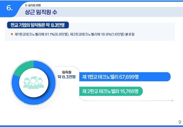기업 수 감소에도 임직원 규모는 8만3,465명으로 전년 7만8,872명 대비 4,593명(약 6%) 증가했다. 제2판교의 본격적인 입주가 진행되면서 고용 규모가 꾸준히 확대되는 흐름이 확인됐다.