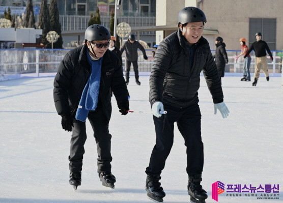 | ▲24일 거북섬 스케이트장에서 임병택 시장(오른쪽)과 문광만 지회장(왼쪽)이 스케이트를 타고 있다.(사진=시흥시) |