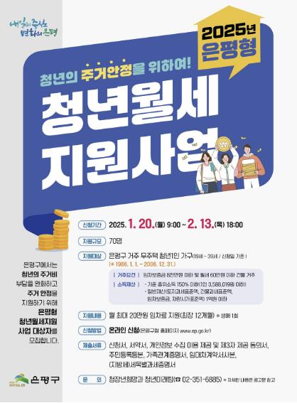 지원 대상은 신청일 기준 은평구에 주민등록을 두고 있는 19세에서 39세 무주택 1인 가구 청년이다.