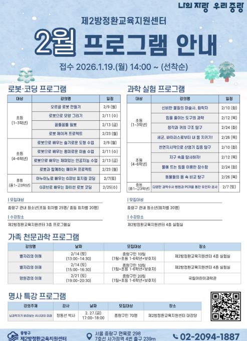 2월 겨울방학 특강은 로봇·코딩 프로그램과 과학 실험 프로그램을 중심으로 운영되며, 가족이 함께 참여하는 천문과학 프로그램을 포함해 구성됐다. 특히 천문과학 프로그램은 국립어린이과학관을 방문해 가족이 함께 전시와 체험 활동에 참여하는 방식으로 운영돼, 보다 생생한 과학 학습 경험을 제공할 예정이다. 2월 프로그램은 1월 19일부터 제2방정환교육지원센터 누리집을 통해 온라인 선착순 접수를 진행한다.