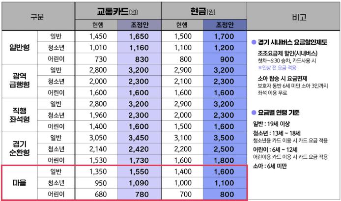 그 결과 교통카드 기준 △일반 시내버스 요금은 성인 1450원→1650원, 청소년 1010원→1160원, 어린이 730원→830원 △직행좌석형과 광역급행형(M) 버스는 성인 2800원→3200원, 청소년 1960원→2300원, 어린이 1400원→1600원 △경기순환형 버스는 성인 3050원→3450원, 청소년 2140원→2420원, 어린이 1530원→1730원 △마을버스 요금은 성인 1350원→1550원, 청소년 950원→1090원, 어린이 680원→780원으로 각각 인상된다.