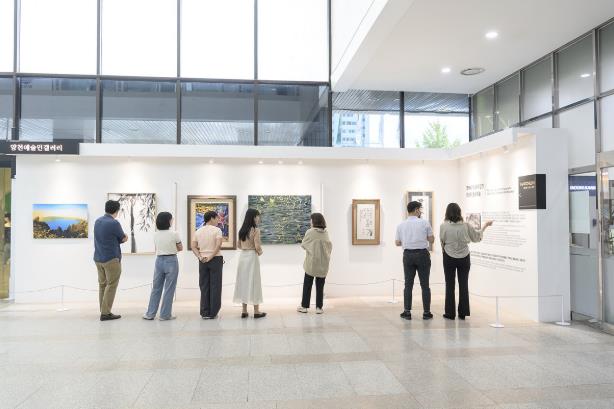 ▲ 양천구청 1층 로비에 조성된 ‘양천예술인갤러리’에서 작품을 감상중인 구민들 |
