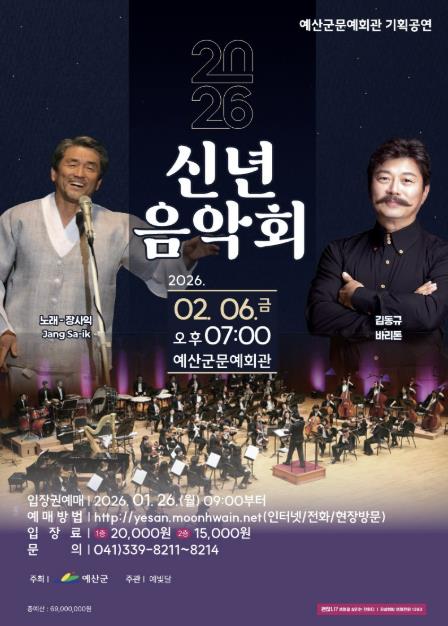 예산군은 군민과 함께 희망찬 2026년 새해를 여는 ‘2026년 신년 음악회’를 오는 2월 6일 오후 7시 예산군문예회관 공연장에서 개최한다고 밝혔다.