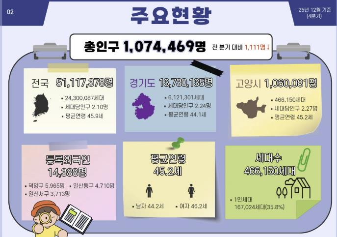 고양특례시가 저출생·고령화 등 급변하는 인구구조 변화에 선제적으로 대응하기 위해 ‘고양시 인구현황 브리핑’을 운영한다. 시는 인구 규모와 연령구조, 출생·사망, 인구이동 등 주요 지표를 행정동 단위까지 세분화해 인포그래픽으로 시각화하고, 이를 시청 홈페이지 행정자료방을 통해 정례적으로 공개할 계획이다.