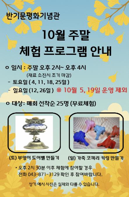 음성군 제8대 유엔사무총장 반기문 평화기념관에서는 관람객을 위해 10월 주말 무료 체험 프로그램을 운영한다.