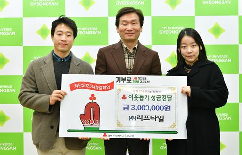 조현일 경산시장은 “어려운 경제 상황 속에서도 이웃 사랑을 실천해 주신 ㈜리프타일 임직원분들께 깊이 감사드리며, 기탁해 주신 성금은 추운 겨울 어려운 이웃들에게 따뜻한 온정을 전하는 데 소중히 사용하겠다”고 밝혔다.
