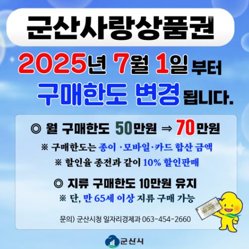 군산시가 7월부터 군산사랑상품권의 월 구매 한도를 기존 50만 원에서 70만 원으로 확대 운영한다.