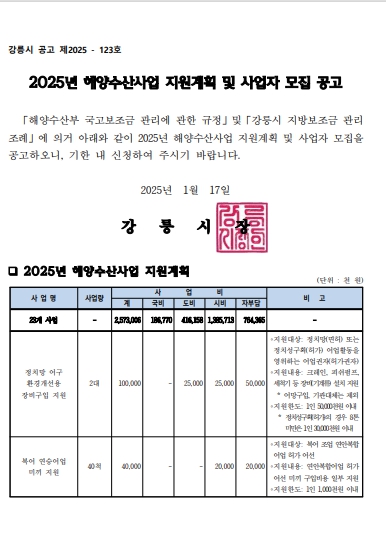 강릉시는 2025년 해양수산분야 보조사업 신청 접수를 1월 20일(월)부터 2월 21일(금)까지 33일간 받는다.