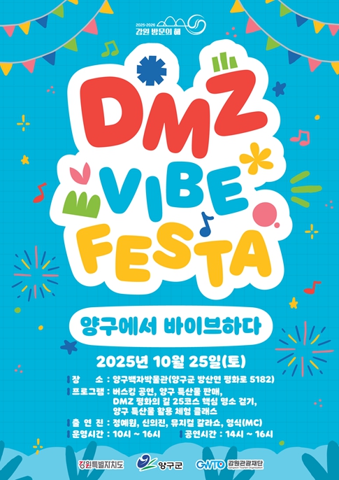 강원관광재단이 강원특별자치도, 양구군과 함께 오는 10월 25일 양구군 백자박물관 잔디마당에서 ‘디엠지 감성 축제(DMZ VIBE FESTA) 양구에서 바이브하다’를 개최한다고 밝혔다.