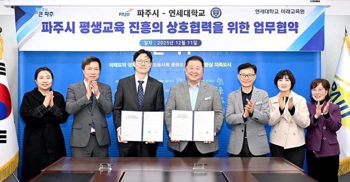 파주시는 지난 11일 연세대학교 미래교육원과 ‘일생일대 프로젝트’의 공동 기획·운영을 위한 평생교육 진흥 업무협약(MOU)을 체결하고, 2026년 사업 확대를 위한 협력 체계를 본격 가동했다.