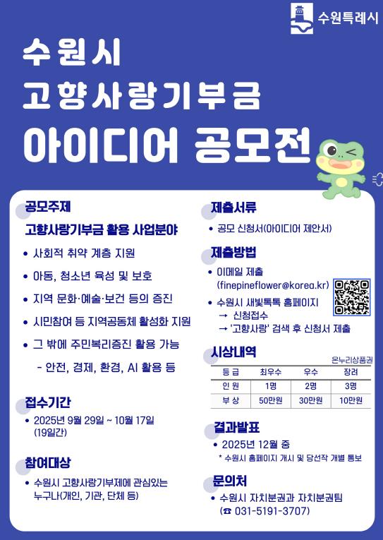 수원특례시는 고향사랑 기부금의 활용도를 높이고 지역 특성에 맞는 발전 방안을 마련하기 위해 ‘고향사랑 기부금 활용 아이디어 공모전’을 10월 17일까지 연다.