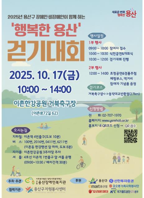서울 용산구가 오는 17일 오전 10시 이촌한강공원 거북축구장 및 산책로 일대에서, 구립용산장애인복지관 주최로 열리는 ‘2025 장애인과 비장애인이 함께 하는 행복한 용산 걷기대회’를 후원한다.