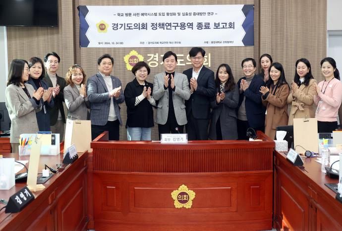 경기도의회 학교안전 혁신 연구회는 24일 경기도의회 교육행정위원회 회의실에서 '학교 방문 사전 예약시스템 도입 활성화 및 실효성 증대방안' 정책연구용역 최종보고회를 개최했다.