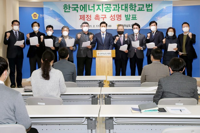 [전남=프레스뉴스] 강래성 기자= 전라남도의회는 17일 오전 11시 의회 브리핑룸에서 기자회견을 갖고 한국에너지공과대학교법의 조속한 제정을 촉구하는 성명서를 발표했다.