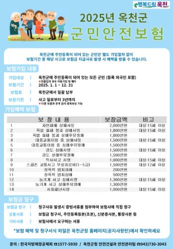 옥천군은 2025년 일상생활 속 각종 재난·사고로부터 피해를 입은 군민에게보험금을 보장하는 군민안전보험에 가입했다고 15일 밝혔다.