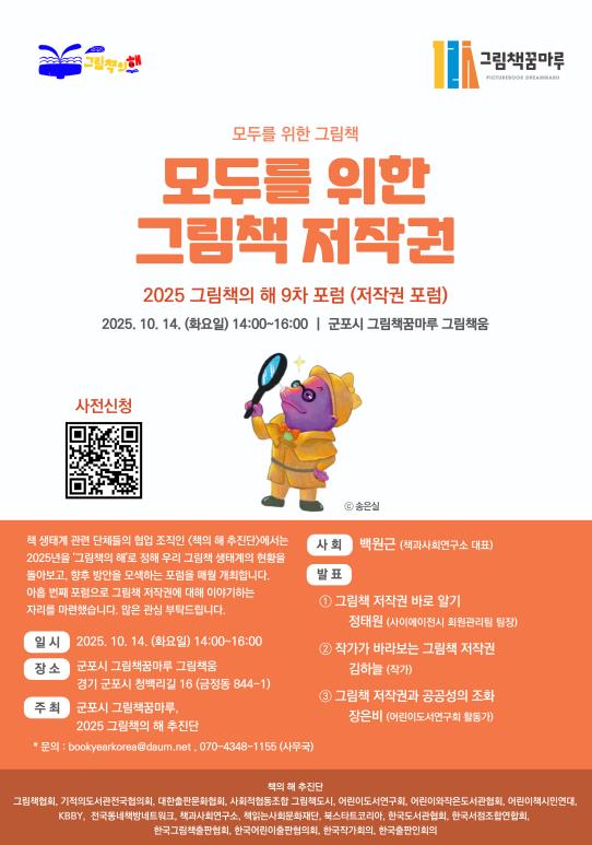 군포시 그림책꿈마루와 2025년 그림책의 해 추진단이 공동 주최하고 백원근 책과사회연구소 대표의 사회로 진행되는 이번 포럼은 ‘모두를 위한 그림책 저작권’이라는 주제로 전문가, 작가, 시민들이 함께 참여하여 그림책 저작권 침해사례와 저작권 보호 및 인식개선방안에 대하여 심도있는 논의를 할 예정이다.
