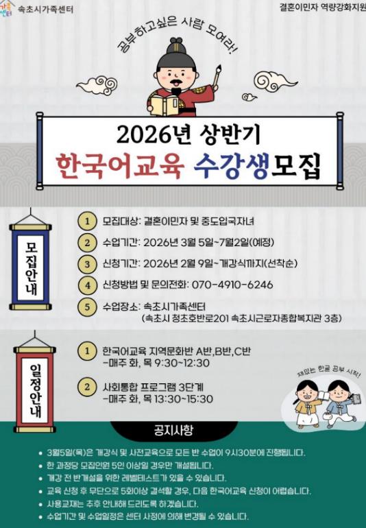 속초시가족센터가 속초시에 거주하는 결혼이민자의 지역사회 정착과 자립을 돕기 위해 상반기 한국어 교육과 운전면허 취득 지원사업 참여자를 모집한다.