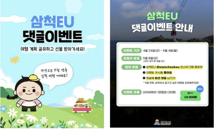 아울러 관광지 운영과 함께 온라인 홍보도 강화한다. 삼척시 공식 관광 SNS 채널 ‘삼척EU’를 통해 5월 가정의 달을 겨냥한 참여형 이벤트를 마련해 관광객과 시민의 관심을 유도할 계획이다.