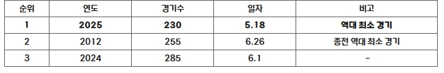 ▲ 역대 400만 관중 달성 최소 경기수 순위 |