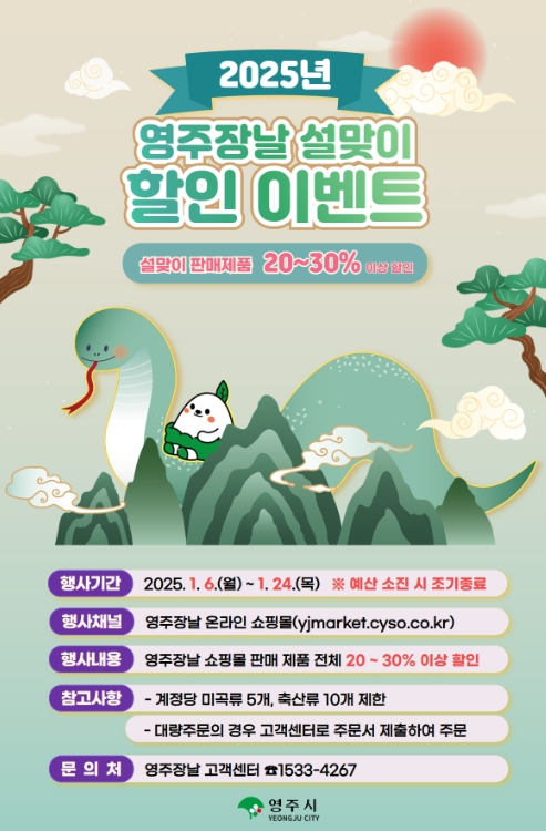 영주시는 을사년 푸른 뱀의 해, 설 명절을 맞이해 오는 6일부터 24일까지 시 공식 농특산물 쇼핑몰 ‘영주장날’에서 설맞이 대규모 할인행사를 개최한다.