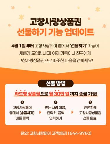 고창군이 고창사랑상품권(카드형)을 간편하게 주고받을 수 있는 ‘선물하기’ 모바일 서비스를 4월부터 시행 중이라고 밝혔다. 서비스는 고향사랑페이 앱 통해 이용 가능하다.