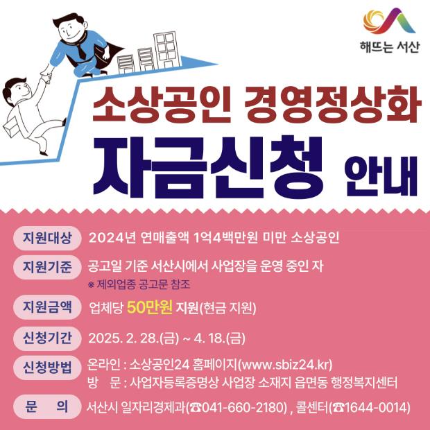 지원에 대한 자세한 사항은 28일 서산시 누리집 고시·공고를 참고하거나 충남경제진흥원 콜센터, 서산시 일자리경제과에 문의하면 된다.