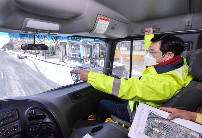 | ▲ 제설작업 현장점검, 이용섭 시장도 제설작업 차량에 직접 탑승(광주시 제공) |