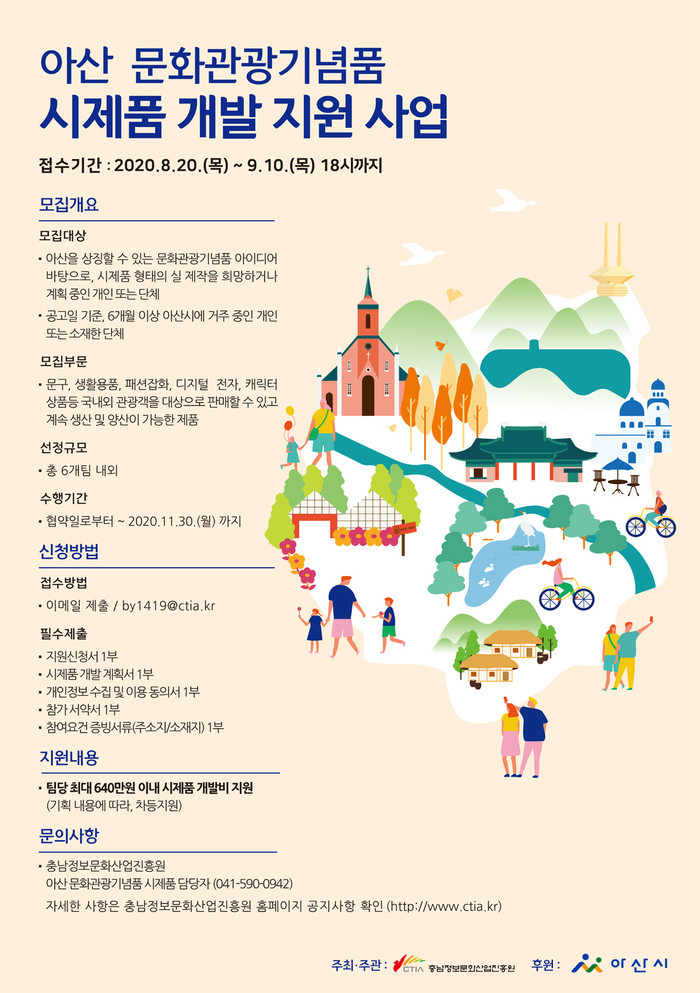 충남 아산시를 상징하고 대표할 문화.관광기념품 개발을 위한 시민참여 문화관광기념품 시제품 개발지원 사업이 운영된다.