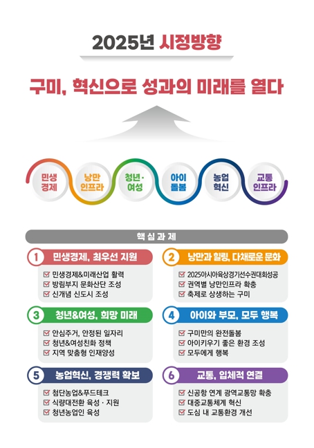 구미시는 2025년 시정목표를 ‘혁신으로 성과의 미래를 열다’로 정하고, 그동안 추진해 온 변화와 혁신을 바탕으로 시민의 삶을 질을 높이고, 모두가 살고 싶은 도시로 도약하겠다고 밝혔다.