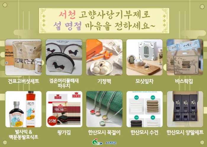 주요 답례품으로는 고향사랑한돈세트, 소곡주, 김, 박대, 모시떡, 서리태, 건표고버섯 등이 있으며, 올해는 막걸리떡, 모싯잎차, 표고버섯 세트, 발효식초, 모시공예품 등 서천군의 정체성을 담은 11개 품목이 새롭게 추가됐다.
