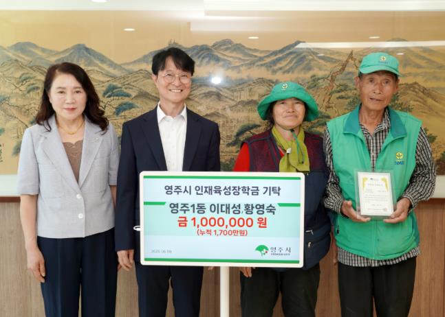 (재)영주시인재육성장학회는 지난 6월 9일, 영주1동 새마을지도자인 이대성·황영숙 부부가 인재육성 장학금 100만 원을 기탁했다고 밝혔다.