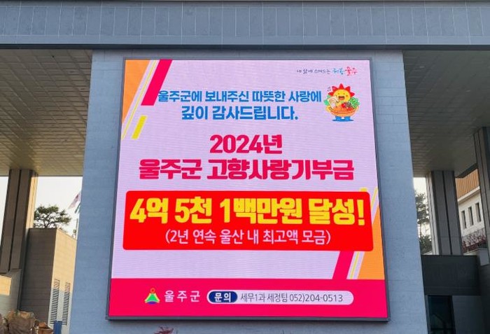 울주군은 이날 고향사랑기부에 참여해 준 기부자에 대한 감사를 전하고자 군청 입구 전광판에 감사 영상을 게시했다.
