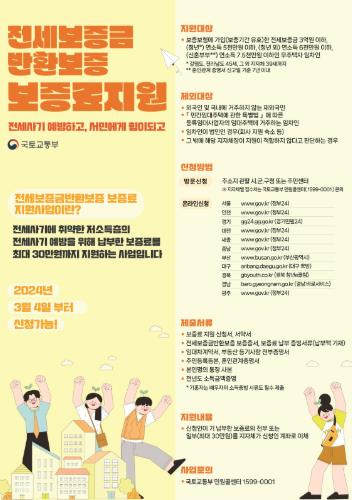 전세보증금 반환보증은 전세 계약 종료 후 임대인이 임차인에게 반환하는 전세보증금을 책임지는 보증 상품으로, 시는 보증 가입에 필요한 보증료 전액 또는 일부를 30만 원 이내에서 지원한다.