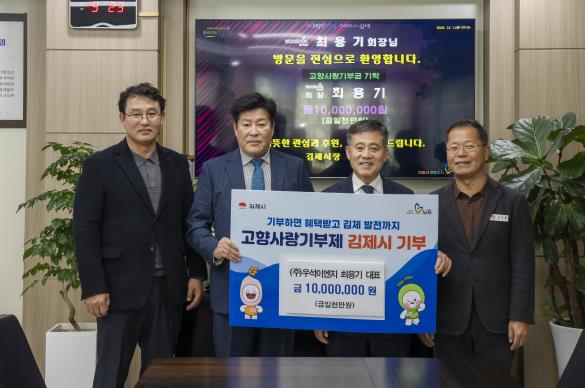 김제시는 2일 ㈜우석이엔씨 최용기 회장이 김제시 고향사랑기부제에 1,000만원을 기탁했다고 밝혔다.