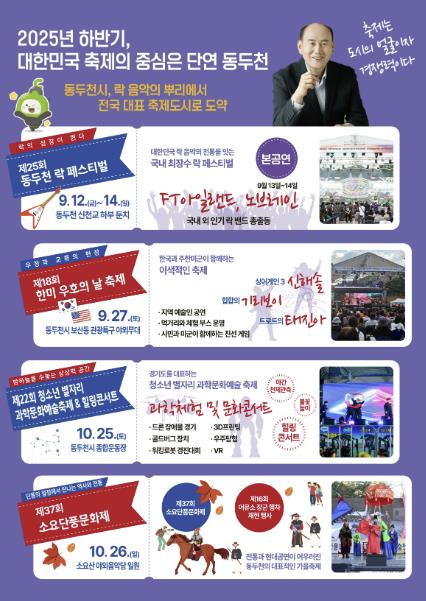 동두천시는 이러한 흐름 속에서 문화적 유산과 지역 정체성을 바탕으로 ‘경쟁력 있는 축제도시’를 만들어가고 있다. 한국 락 음악의 발상지라는 문화자산을 활용한 ‘동두천 락 페스티벌’, 주한미군과의 오랜 공존을 상징하는 ‘한미 우호의 날’, 청소년에게 꿈과 희망을 선물하는 ‘별자리 과학문화예술축제’ 등은 모두 동두천만이 보여줄 수 있는 고유한 스토리를 담고 있다.