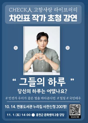 홍천군립도서관은 11월 1일 오후 2시 홍천군 문화센터 2층 강당에서 차인표 작가를 초청하여 체크인 고향사랑 라이브러리 마지막 강연을 개최한다.