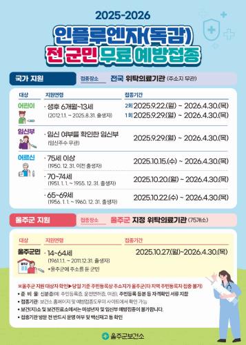 접종기간은 내년 4월 30일까지며, 울주군 내 위탁의료기관 78개소와 보건소에서 접종 가능하다.
