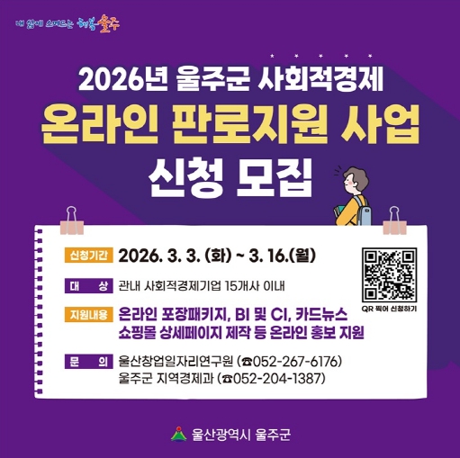 울산 울주군이 3일부터 오는 16일까지 ‘2026년 울주군 사회적경제 온라인 판로 지원사업’에 참여할 기업을 모집한다고 밝혔다.