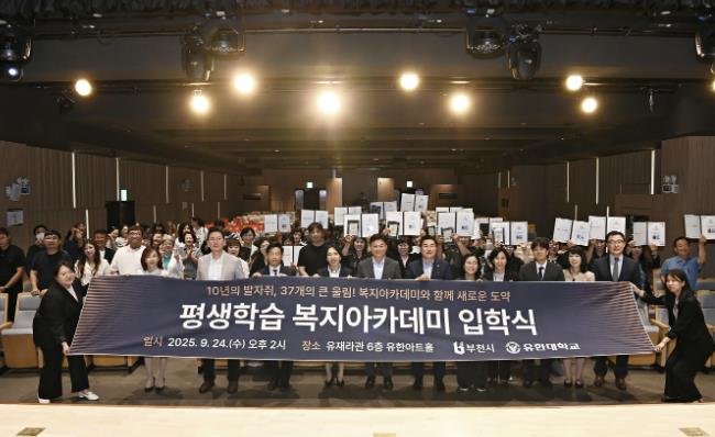부천시는 지난 24일 유한대학교에서 ‘부천시·유한대학교 복지아카데미’ 입학식과 업무협약식을 열었다. 이번 행사는 조용익 부천시장과 장은영 유한대학교 총장을 비롯해 37개 동 지역사회보장협의체 위원장 등 150여 명이 참석한 가운데 진행됐다.