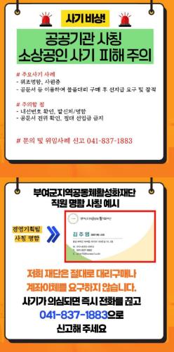 부여군 지역공동체활성화재단은 최근 재단 직원을 사칭하여 물품 구매를 요청하는 의심 사례가 확인됨에 따라, 지역 소상공인과 협력업체를 대상으로 피해 예방 안내에 나섰다고 밝혔다.
