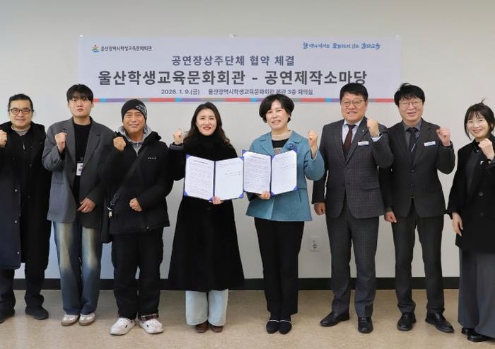 울산학생교육문화회관은 지난 9일 회관 내 회의실에서 지역 공연예술 단체인 ‘공연제작소 마당’과 지역 예술교육 활성화를 위한 업무협약을 맺었다.