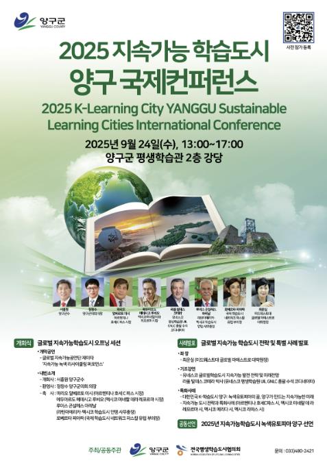 양구군은 24일 평생학습관에서 ‘2025 양구 지속가능학습도시 국제컨퍼런스’를 개최한다. 라틴아메리카 GNLC(Global Network of Learning Cities) 시장단 2명을 포함해 관계자 18명 등 총 21명이 초청되며, 양구군민과 평생교육 관계자 등 200여 명이 온·오프라인으로 함께한다.