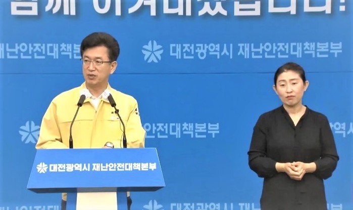| ▲허태정 대전시장이 1일 시청 중회의실에서 코로나19 확진자 추가 발생에 대한 비대면 온라인 브리핑을 진행했다. |