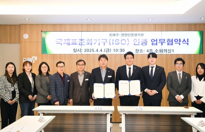 부산 동래구는 지난 4일 경영인증평가원(기관장 신솔푸름)과 지역 내 기업들의 국제 경쟁력 강화를 위한‘국제표준화기구(ISO) 인증업무협약’을 체결했다고 밝혔다.