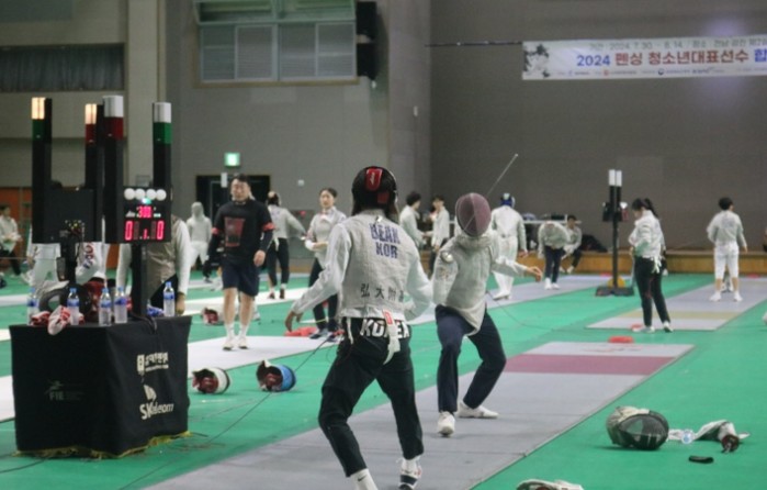 | ▲ 펜싱 청소년 국가대표 선수들이 강진제2실내체육관에서 ‘2024년 하계 전지훈련’을 하고 있다. |