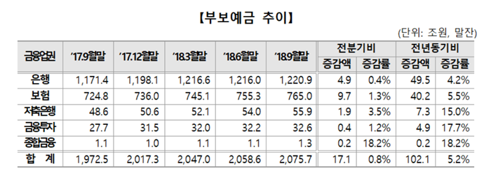 예금보험공사가 28일 발표한 `2018년 3/4분기 예금보험 및 부보금융회사 현황`에 따르면 지난해 9월 말 전체 부보예금 잔액은 2075조7000억원으로 전분기 대비 0.6% 증가한 17조1000억원으로 나타났다.