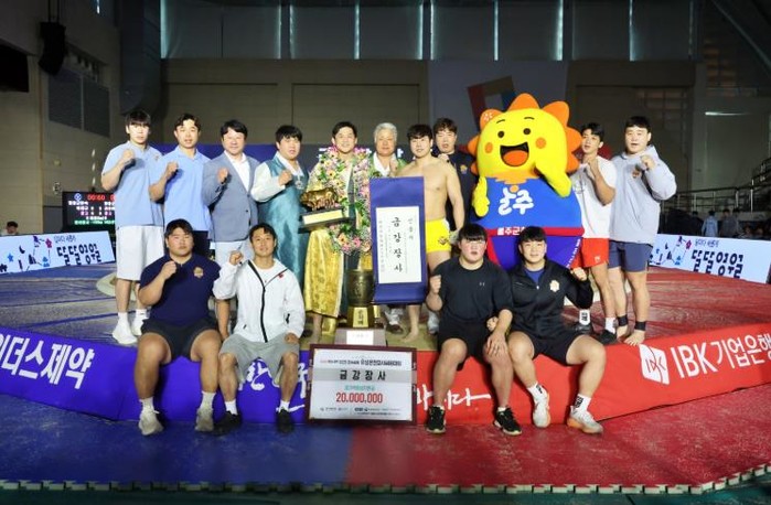 울주군청 해뜨미씨름단 소속 노범수 선수가 지난 13일 국립 한밭대학교 체육관에서 열린 ‘위더스제약 2025 민속씨름 유성온천장사씨름대회’에서 금강장사에 등극했다.