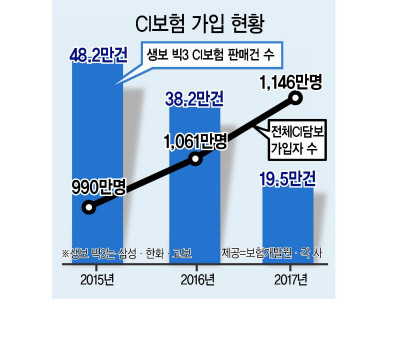 3일 업계에 따르면 지난해 삼성생명과 한화생명, 교보생명 등 생보사 빅3의 CI보험 총 판매 건수는 19만5000건이다. 이는 재작년 38만2000건의 절반 수준이다. 2016년에도 2015년보다 20.7% 줄었던 점을 살펴보면, 하락 폭이 매년 확대되고 있다.